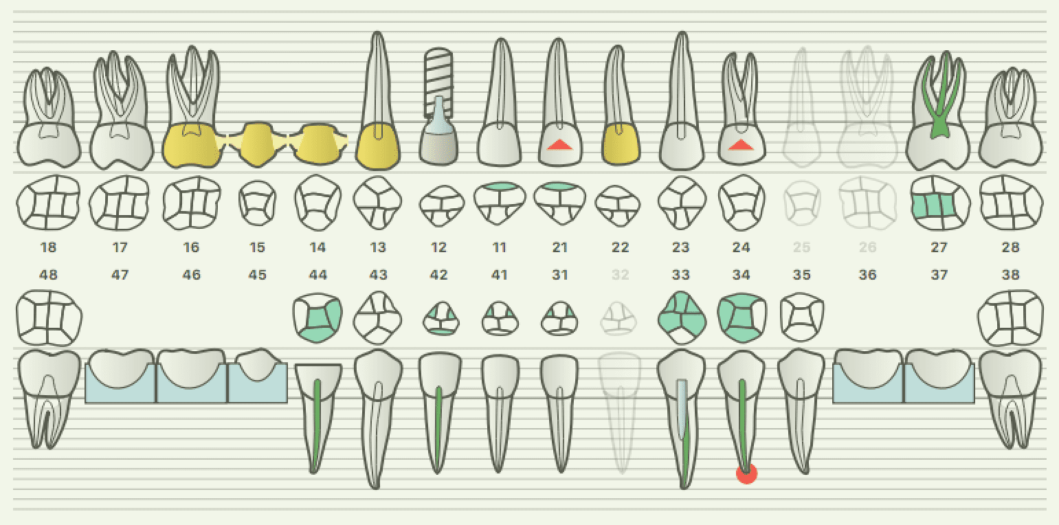 Hambastaatus. Ravikaardis registreeritakse täidiste asukohad, vahetamist vajavad täidised, hambaaugud ehk kaaries, kulunud hambad, juurealused põletikukolded, puuduvad hambad jne, et saada alati hea ülevaade patsiendi suust ning ravi vajavatest hammastest.