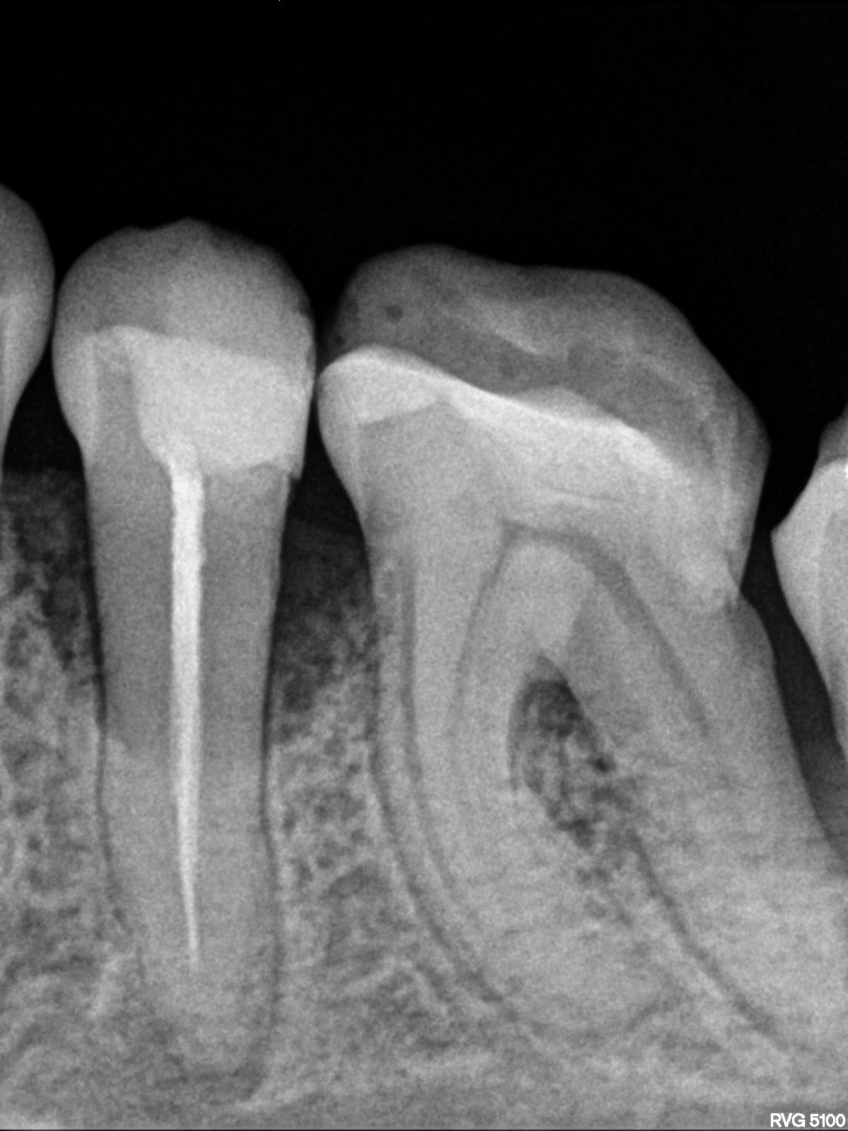 Periapikaalne röntgenülesvõte ehk väike täpsustav ülesvõte. Antud röntgenülesvõttel on hästi näha juureravitud hambal juuretipu ümbruses põletikukolle. Lisaks on hambal parodontiidi tõttu tekkinud luukadu.