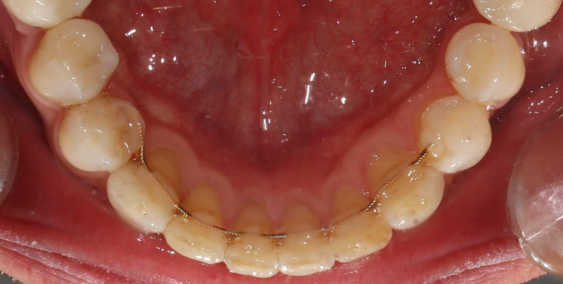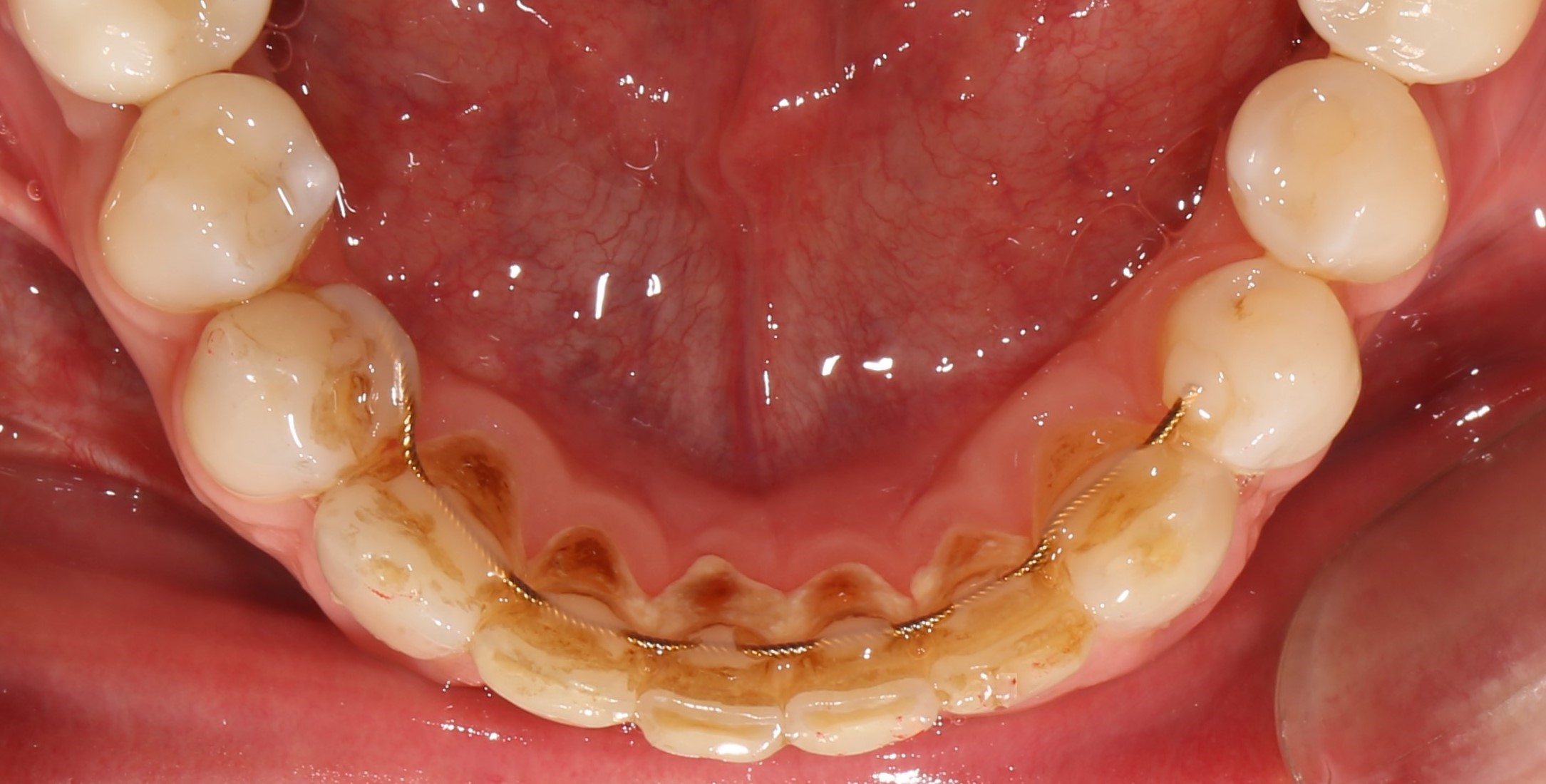 Alumiste esihammaste taha kinnitatud hoide- ehk reteiner traadi ümbrusesse tekkinud hambakivi ja pigment