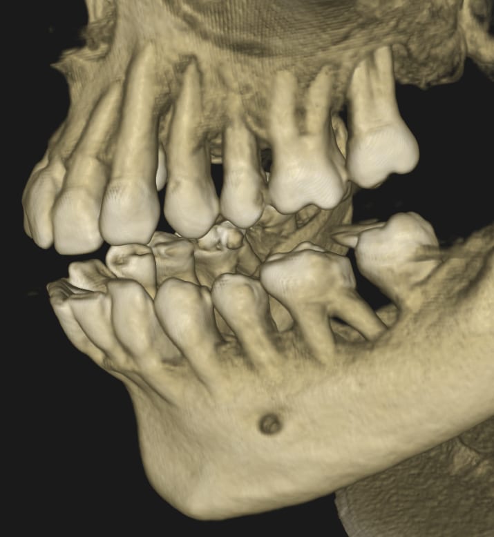 CBCT ehk lihtsas keeles 3D röntgenülesvõte võimaldab vaadata lõualuude sisse ja täpsemalt analüüsida probleemkohti näiteks kas juure all on põletikukolle, kas on piisavalt luu kõrgust ja laiust implantaadi asetamiseks jne. Pildil nö ülevaatlik vaade.