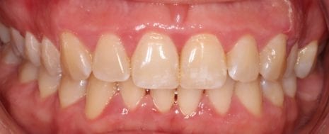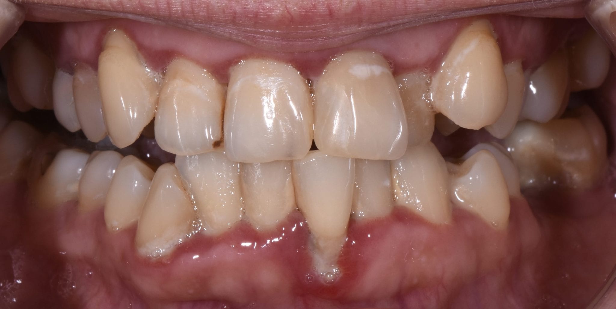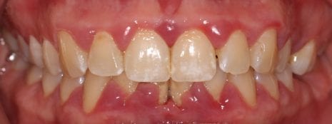 Konsultatsioonil tehakse sageli ka fotod probleemkohtade fikseerimiseks ja patsiendile paremini selgitamiseks. Antud fotol on näha hästi patsiendi hambumushäire (hammaste ruumipuudus), hambakatt ja -kivi ning seetõttu tugevas põletikus olevad igemed (punetus igeme servas)