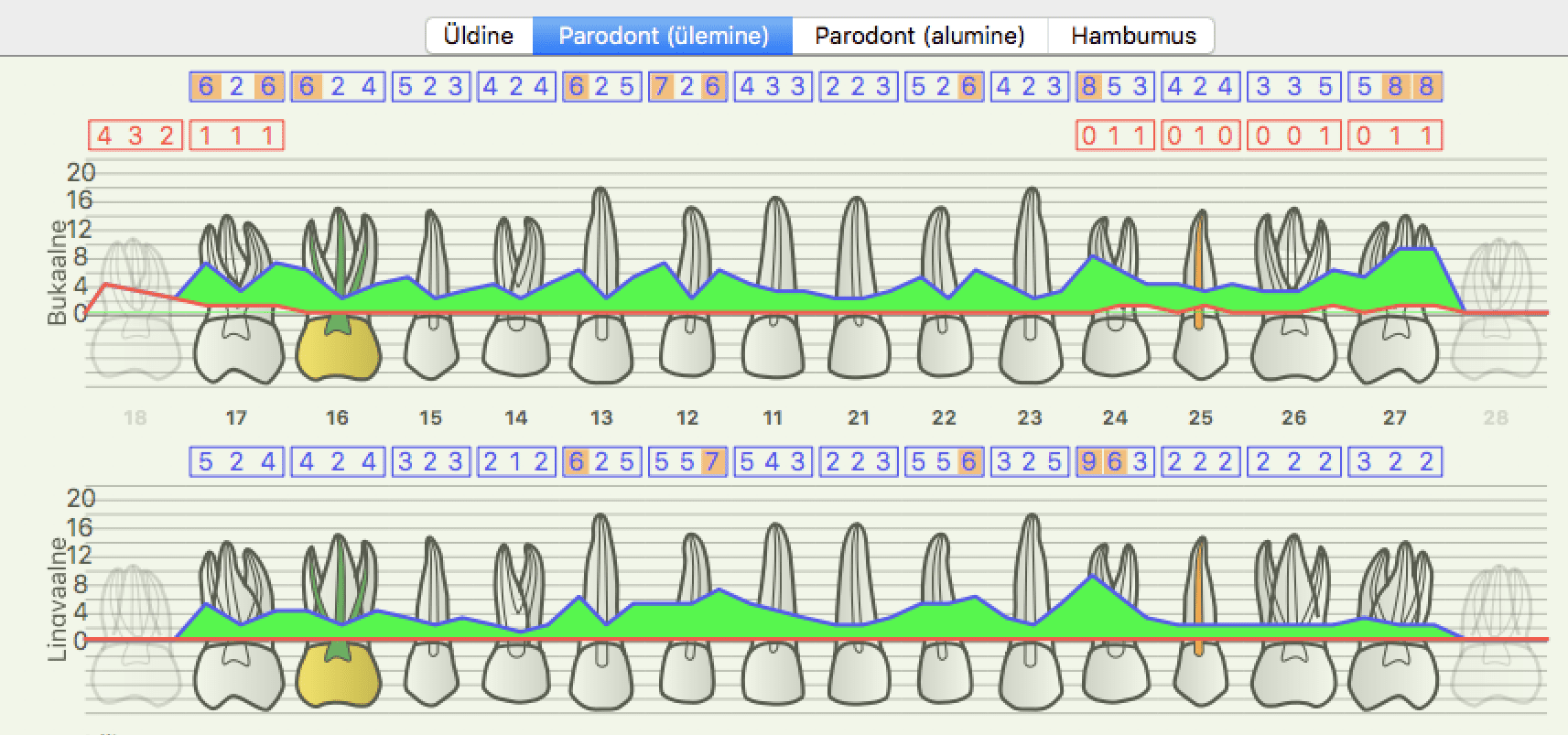 Igemekaardi näidis ehk parodontoloogiline staatus. Igemekaardil märgime igemeserva kauguse hamba emailijoonest ja mõõdame igemetaskute sügavused. Märgime veritsevad kohad, hammaste liikuvused jne. See on oluline informatsioon igemehaiguse paranemise ja progresseerumise jälgimiseks.